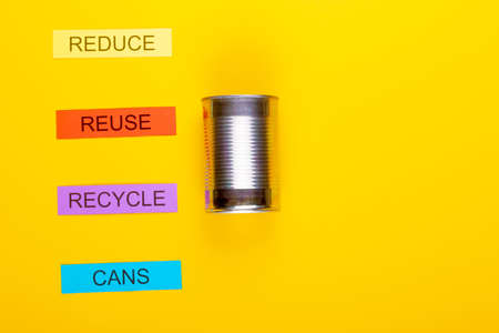 Recycling concept showing reduce, reuse, recycle & cans on a yellow background
