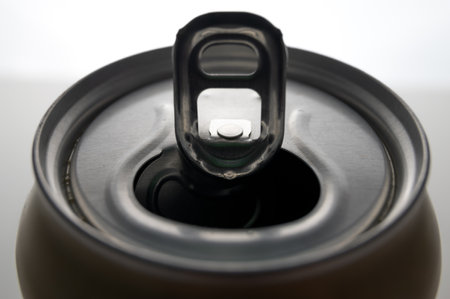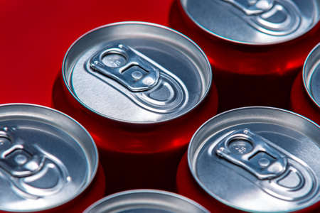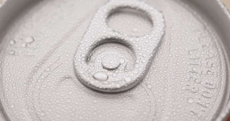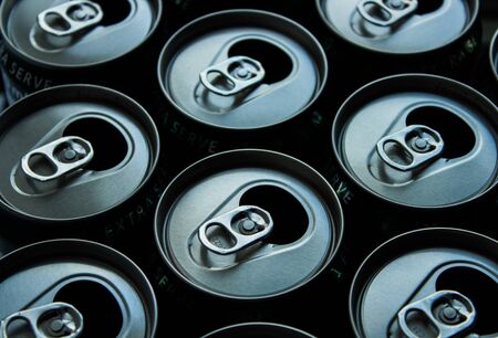 Closeup aluminium cans, focus on pull tab open of canned of soft drink. selective focus