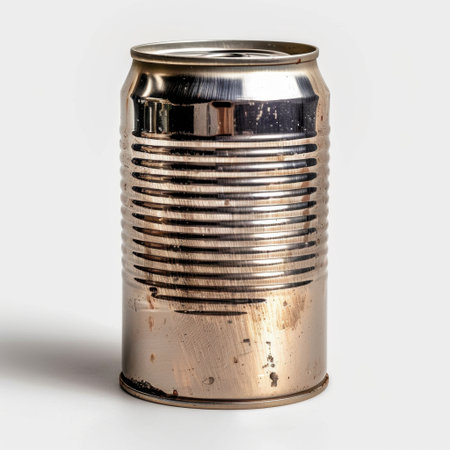 A metallic food can featuring visible rust and dirt, isolated on a white background. This image captures the texture and reflections, ideal for packaging themes.