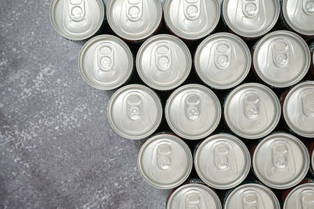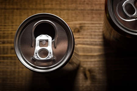 Close-up photo of aluminum jars for cola or beer on a wooden background