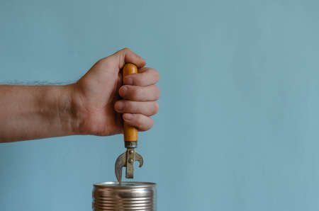 Man's hands open a tin can with an old can opener with a wooden handle. Canned food and a special knife. Adult male of European race.