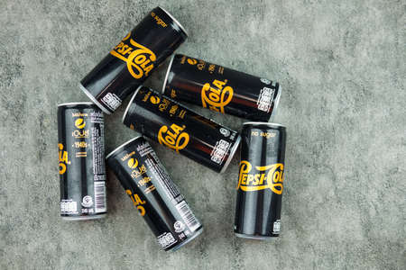 Samut Prakan, Thailand - December 15, 2021 : 6 cans of Pepsi-Cola No sugar Limited Edition design size of 245 ml. Pepsi is the most popular carbonated soft drink beverages sold around the world