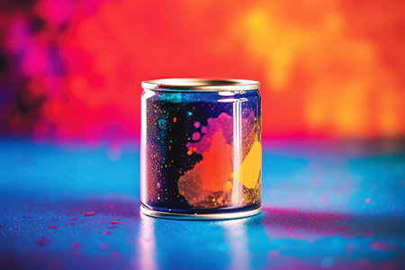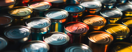 Dramatic abstract composition featuring a captivating arrangement of stacked canned food items highlighting vibrant lighting shadows and textures to create a visually striking and expression