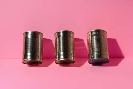 Non-perishable canned goods on colorful background. Pandemic kit staple. Food food staples prepared to survive Coronavirus COVID 19 pandemic at the time of quarantine and home isolation