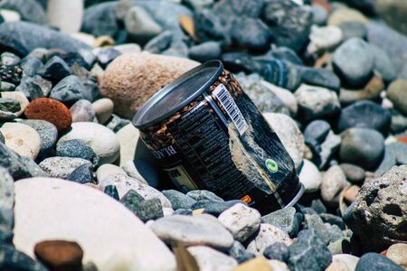 Limassol Cyprus June 12, 2020 Closeup of various pollution of metallic and plastic waste found on one of the natural beaches near the town of Limassol in Cyprus