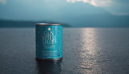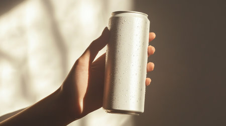 Hand holding a sleek white can with water droplets, minimal light background and soft shadows creating a fresh look.