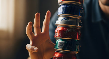 A person's hand is shown cautiously approaching or steadying a tall, wobbly stack of various aluminum soda cans. The precarious balance of the cans can symbolize risk, addiction, or the instability of an unhealthy diet.