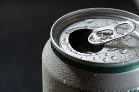 A wet can of a cold and tasty drink. Water drops on the metal surface of the metal container. Dark background.