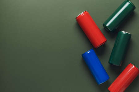 Set of aluminum cans on red background, top view. Recycling packaging to save our planet.