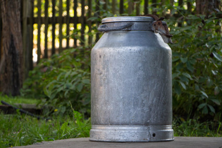 Vintage aluminum milk can standing outdoors against a rustic fence and green foliage, capturing a nostalgic rural scene and a sense of simpler times