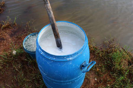 Bucket of milk from the farm, vintage aluminum milk can on wooden floor on old wooden boards background
