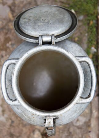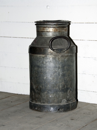 old kind of aluminum bidon for milk storage stands on kitchen table
