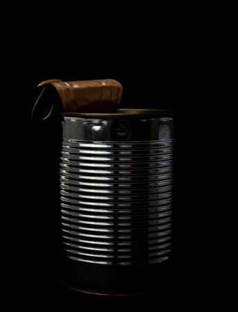 Simple used tin can with curled lid, isolated on black background. . High quality photo