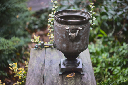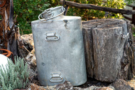 Yellow metal milk container stands on a stump in the village. High quality photo