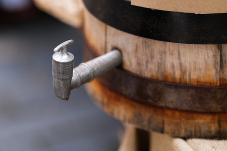 Old smudgy wooden barrel for fuel oil closeup