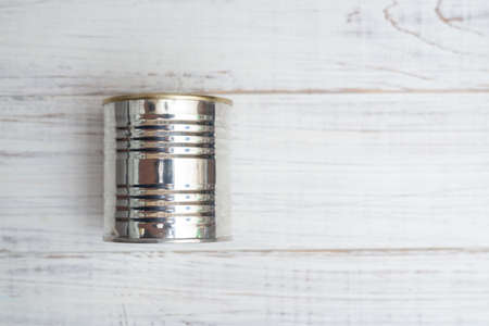 Closed metal can of canned food on a white wooden background.
