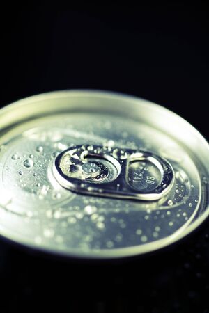 The lid of the aluminum can from the carbonated drink is covered with droplets of condensate.