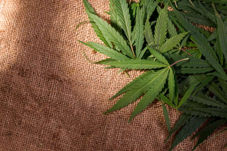 Fresh green cannabis leaves on sackcloth surface. Crime and punishment theme for Possession of narcotic.