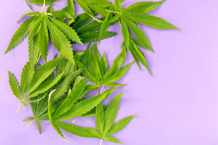 Close up fresh cannabis leaves on purple background