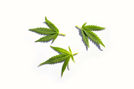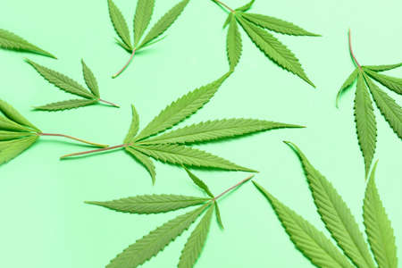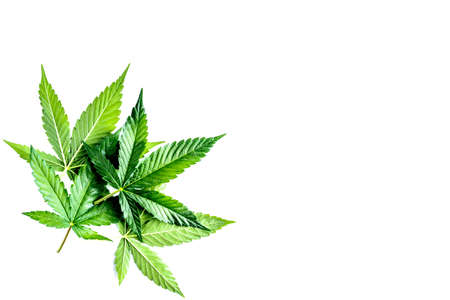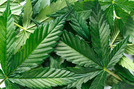 Cannabis is a standoff between a drug and a medicine. Green background of leaves.Close-up young hemp. Medicinal indica with CBD.Green cannabis leaves isolated on white background.
