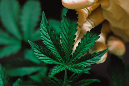 Hand of medical worker and plant and leaves of cannabis macro growing a macro shot on a vegetation medical marijuana Marijuana leaves
