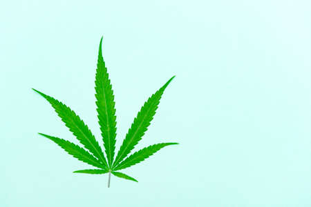 Fresh cannabis green leaf on blue paper background.