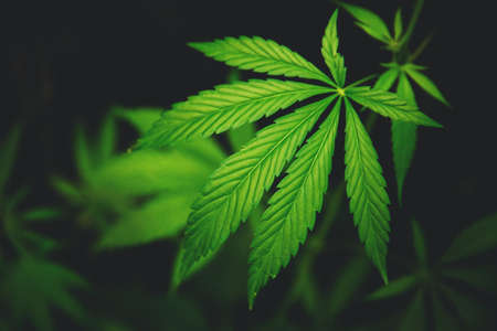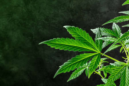 Leaf green marijuana hemp cannabis on blurred dark background