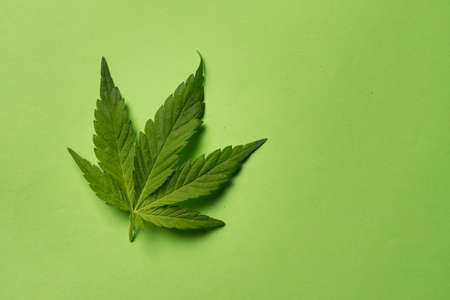 Fresh marijuana leaf on green background
