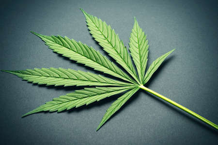 Green marijuana leaf on gray