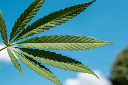Hemp leaf on a sky background in the afternoon