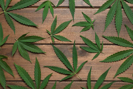 Fresh green hemp leaves on wooden table, flat lay
