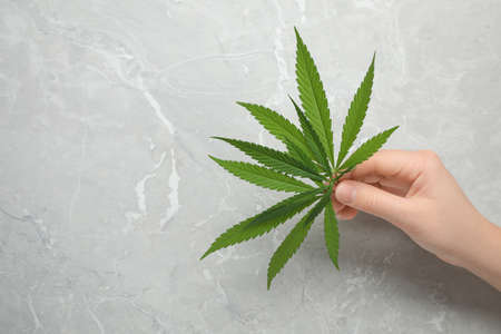 Woman holding fresh green hemp leaf at marble table, closeup. Space for text