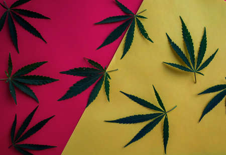 Marijuana leaves, cannabis on a yellow background, beautiful background, indoor cultivation, top view