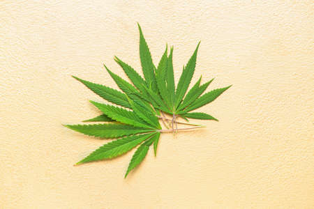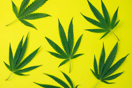 Marijuana leaf. Fresh cannabis plant on yellow background. Hemp recreation, medical usage. Weed legalization.