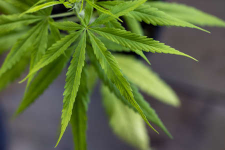 Young cannabis plant. Medicinal indica with CBD. Green background of leaves. In door grow hemp. Legal Marijuana cultivation in the home. Cannabis at the beginning of flowering.