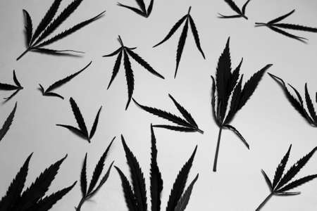 Black marijuana on a white background. Black and white photo. Pattern, layout, top view. Chaos. Grunge toning. Selective focus