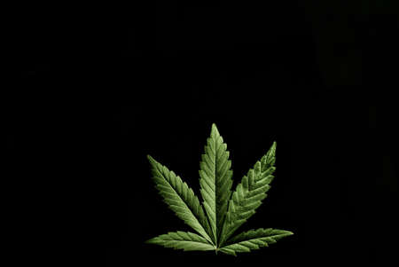 Green hemp leaf on black painted background.