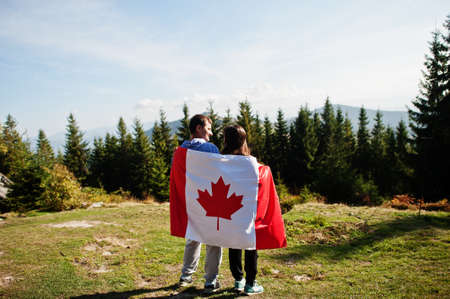 Student of Canada shows diploma with flag of country hanging in background. Student of Canada demonstrates knowledge by showing diploma with excellent grades standing with flag of Canada in background