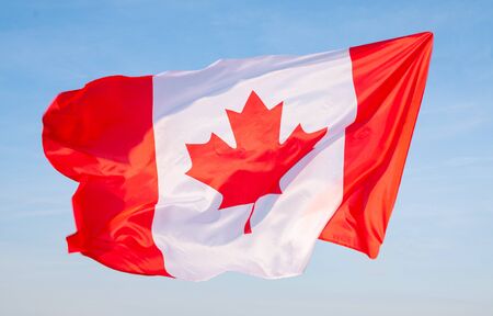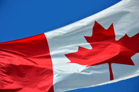 Vivid image of the national flag of canada fluttering in the breeze with a clear blue backdrop