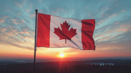 The Canadian flag waves proudly at sunset with a vibrant sky