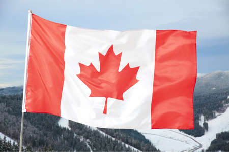 Close up of National Flag of Canada with natural mountains and trees scenery in the background.