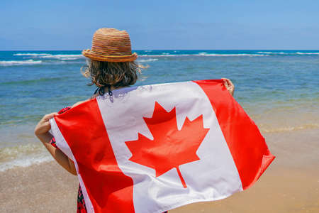 Woman in hat with Canada flag at the beach. Girl holds an Canada Flag while standing on the beach, back view. Young woman with the Canada flag on blue sky background.