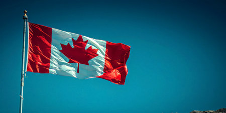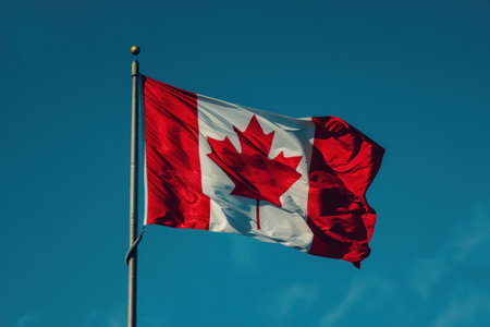 Vibrant canadian flag flutters in the wind under a clear blue sky