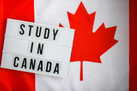 The National Flag of Canada. Lightbox with text STUDY IN CANADA Canadian Flag or the Maple Leaf. Patriotism. International relations concept. Independence day. Immigration