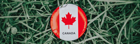 Round circle badge with red white Canadian flag maple leaf lying in grass on green forest nature background. Web banner header for website. Canada day holiday national celebration.