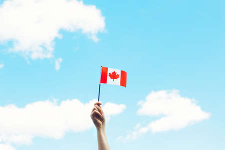 Closeup of woman human hand arm waving Canadian flag against blue sky. Proud citizen man celebrating national Canada Day on 1st of July outdoor.