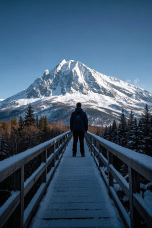 Man gazing out at the snow capped mountains from the wooden plank road