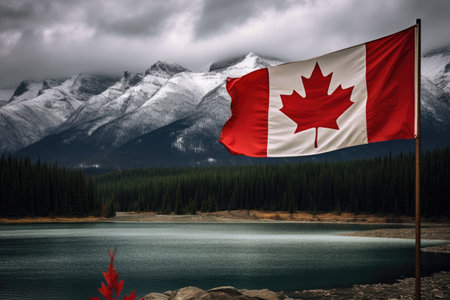 Canadian flag waving in the wind against scenic view of lake and mountains, Canada flag and beautiful Canadian landscapes, AI Generated