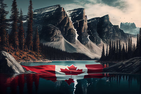 A Canadian flag in northern wilderness landscape, Ai generated image