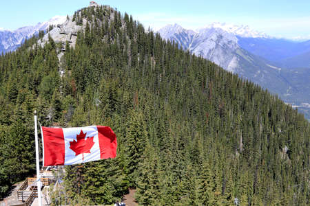 A flag waving in the wind against the backdrop of the mountains. Banff, Alberta, Canada.